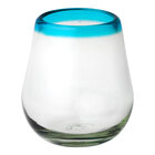 Provide your guests a delightful way to savor their favorite drink with this 10 Strawberry Street Aqua Rim 16 oz. stemless wine glass! Crafted from hand-blown Mexican glass, it features a refreshingly simple, stemless design with a curved bowl and gently tapered rim. The crystal-clear glass showcases your flavorful options, while the vivid, aqua blue rim adds a pop of color, offering an enticing presentation of your red or white wine and sangria.