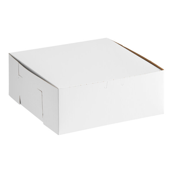 Entice your customers into taking home your delicious cakes, cookies, or muffins with this 10" x 10" x 4" white cake / bakery box. The one piece design allows the lid to be opened easily and then tucked back into place to secure the contents. Make sure your bakery is complete by providing a durable cake box for your customers!