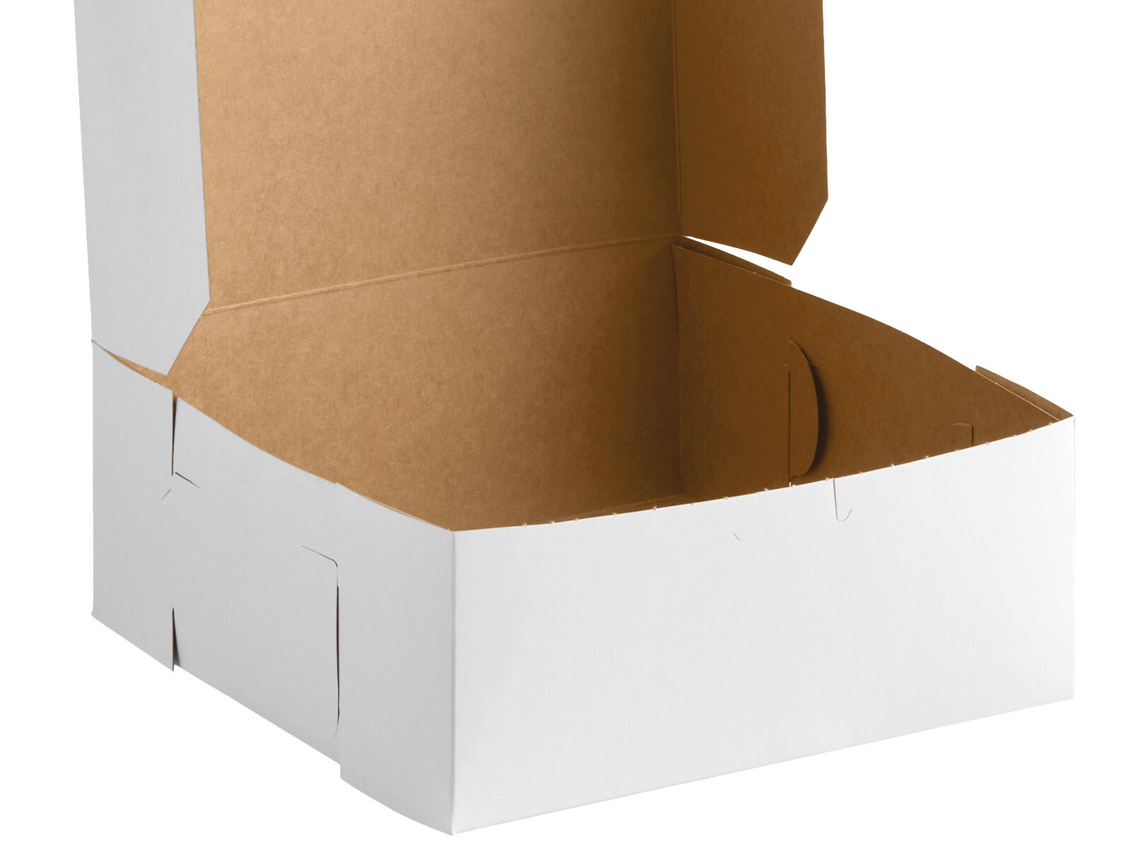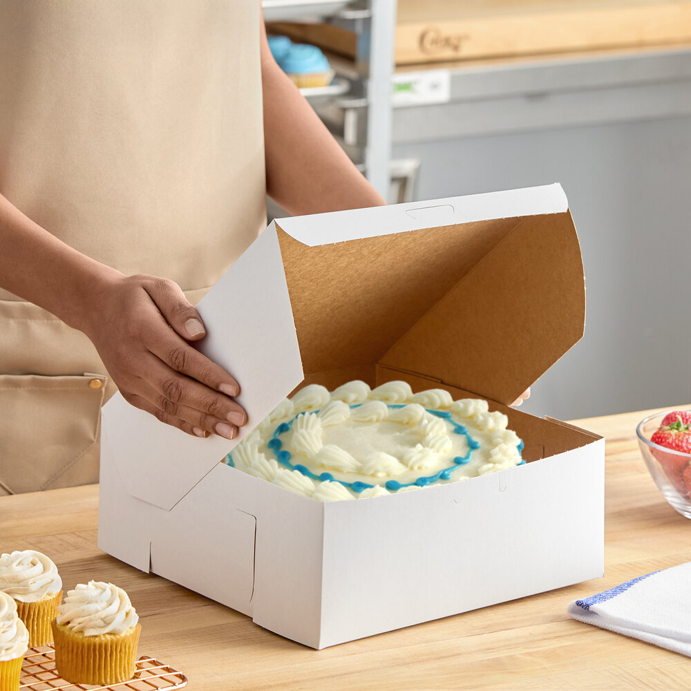 Entice your customers into taking home your delicious cakes, cookies, or muffins with this 10" x 10" x 4" white cake / bakery box. The one piece design allows the lid to be opened easily and then tucked back into place to secure the contents. Make sure your bakery is complete by providing a durable cake box for your customers!