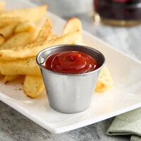 Our metal and plastic sauce cups are convenient for high-volume businesses and outdoor venues because they won't break or shatter if they're dropped. You can choose from smooth sauce cup ramekins or ones with fluted patterns for a classic look. Since we offer so many sizes of cups, you can offer enough ketchup for a small order of fries or a large amount for a big serving shared by a group of people.
