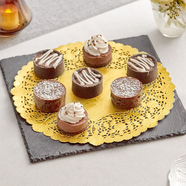 Gold foil lace dollies are great for complimenting your masterpiece. They compliment at almost every type of desserts out there. Sold at a low and good price