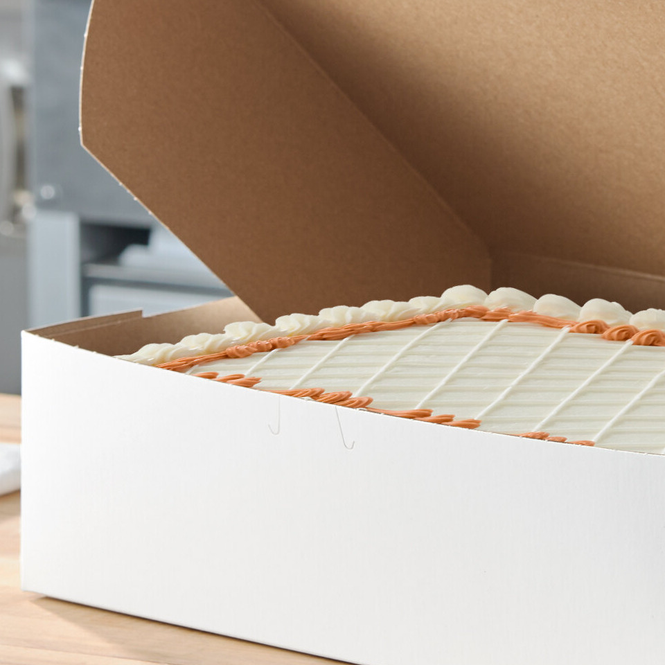 This 14" x 10" x 4" box is the perfect size for holding quarter-sheet cakes, donuts, cookies, or muffins. Whatever your needs are, this versatile cake box is is a convenient item to keep on hand at your bakery.