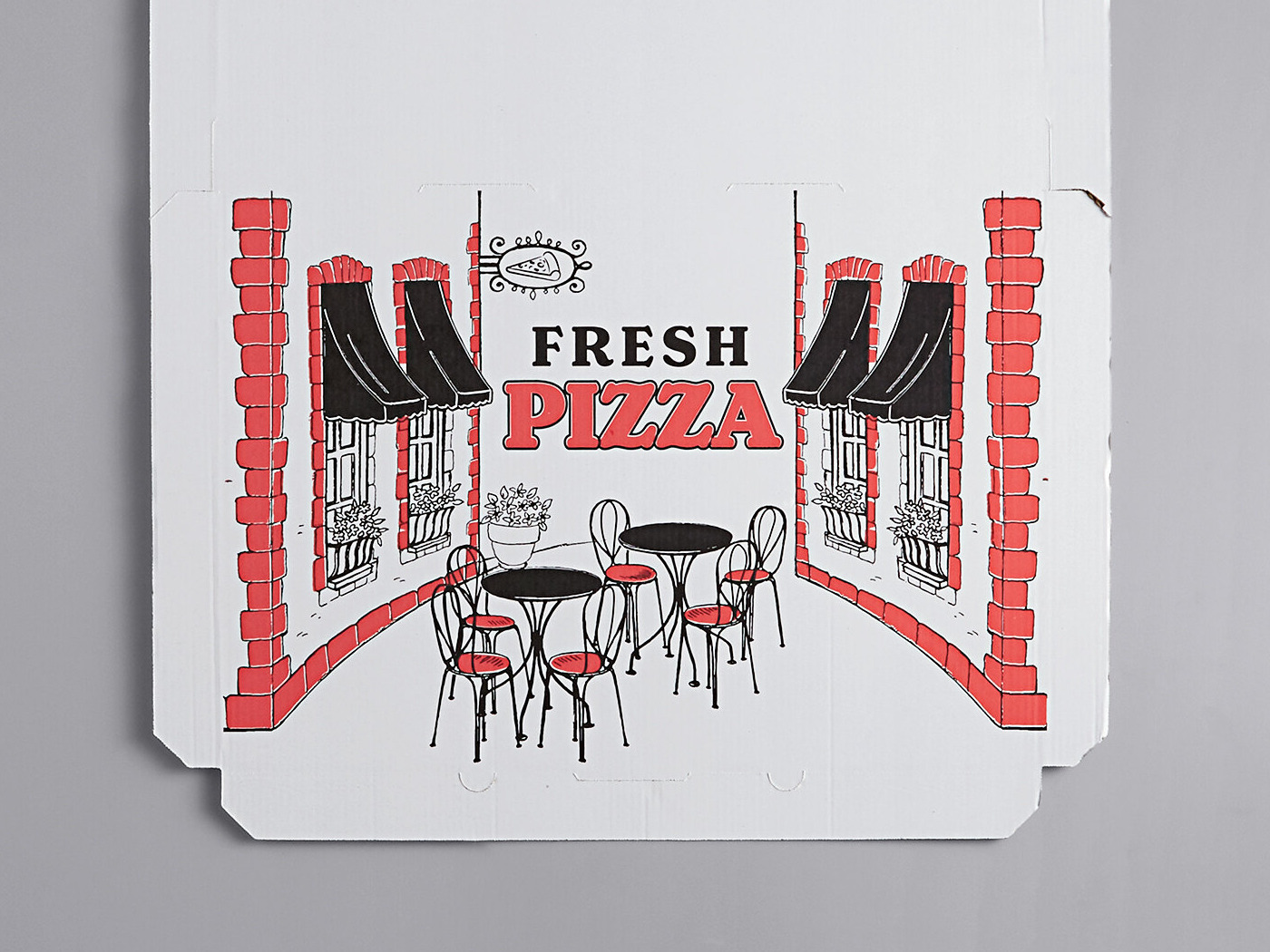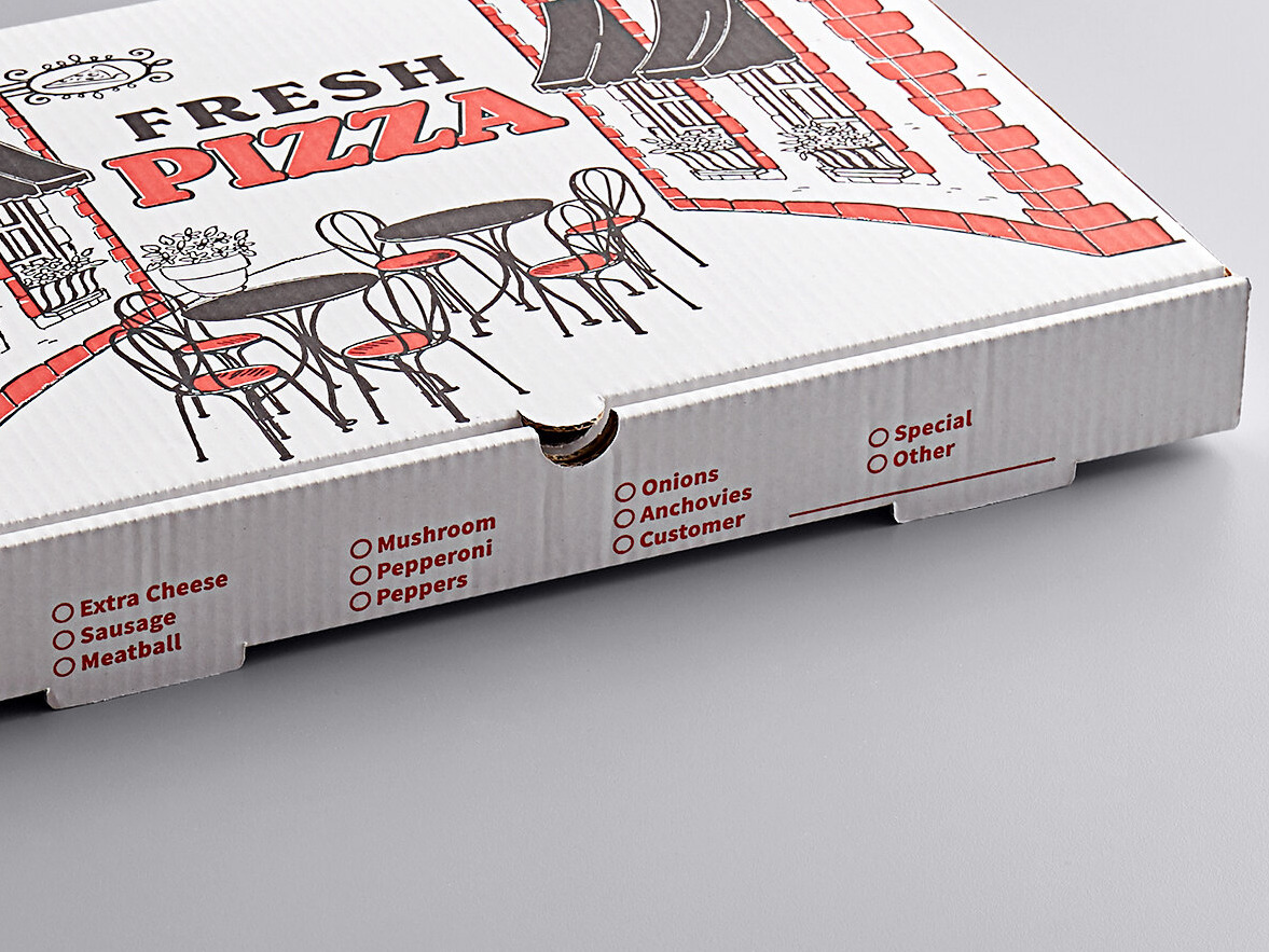 The top of the box features a decorative "fresh oven baked pizza" decal, adding a classic touch to a convenient box.