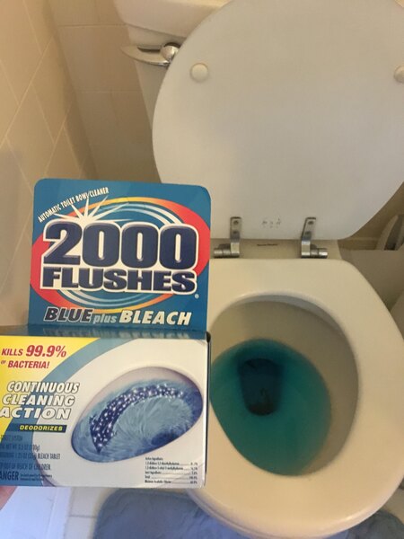 These toilet bowl cleaners seen here are great. They even help prevent the black stuff that accumulates around the bowl that I used to have to brush off weekly. I highly recommend them. And there are 2 tablets, so you don't have to turn the water blue if you don't want to.