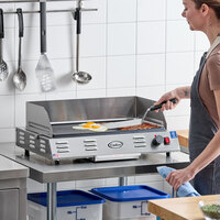 Use a commercial electric griddle to make a variety of foods, including pancakes, scrambled eggs, burgers, and cheesesteaks. We carry standard-duty models with thinner plates that are ideal for handling more delicate breakfast items as well as heavy-duty units with thicker plates that are better suited for cooking frozen items and meats. You can also choose your electric countertop griddle based on its plate size, depending on your low- or high-volume needs.