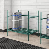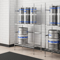 Outfit your beer distribution center, brewery, high-volume bar, or other establishment with a keg rack to keep your keg storage area organized. Use these storage units to neatly hold beer kegs and keep them off the floor. You can also find add-on straps, which are used to prevent kegs from sliding off of the shelves.