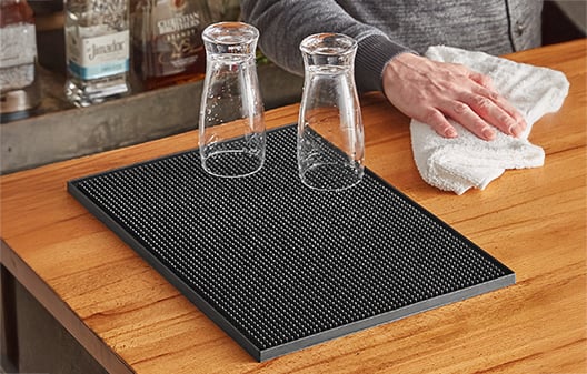 Outfit your bar with bar mats and shelf liners, providing a proper surface for storage and service to ensure an organized and clean workspace.