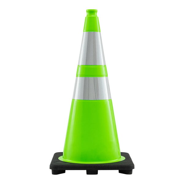 This traffic cone boasts a fluorescent lime green color with (1) 4" and (1) 6" reflective collar for a high level of visibility. It will not fade over time for long-lasting durability and excellent color retention. It is equipped with a 7 lb. black base to remain upright and securely in place. This traffic cones meets MUTCD specifications for traffic control devices.