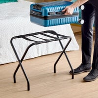 A folding luggage rack gives hotel guests a convenient place to store and unpack their suitcases, and it's an essential item for hotel guest rooms, Airbnbs, and resorts. By providing a suitcase stand, you can help guests feel more at home and provide them with the space they need to organize their belongings. These racks are designed to fold shut for compact storage when not in use. Best of all, we carry options in popular finishes including metal and wooden luggage racks, so it's easy to find a rack to suit the decor in your guest rooms.