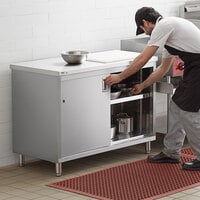 These stainless steel work tables are built in a wide range of sizes so you can pick a product that best fits the space you have in your kitchen. In addition, many of these tables come with doors to help keep stored contents sanitary throughout the day. You can even find enclosed base work tables with backsplashes to protect your walls as your staff works.