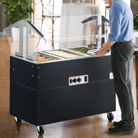 Choose from cafeteria line equipment that features two wells or several wells to accommodate your volume of prepared items. These wells can hold standard food pans or configurations of smaller pans, so you can arrange your presentation to suit your serving needs. Our enclosed base versus open base models can enhance the aesthetic of your buffet in different ways, and you can store additional supplies on mobile carts underneath open base tables.