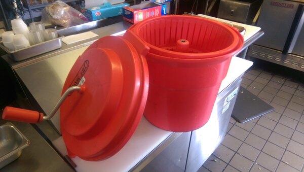if you need to wash greens in large quantities, this giant salad spinner can't be beat. it's a pretty standard fixture in most big volume kitchens and with good reason. it's very sturdy and reliable.