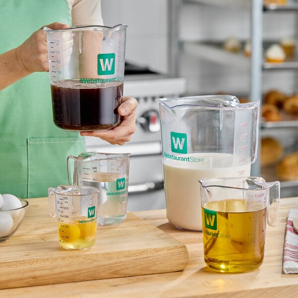 We really love these WebstaurantStore Brand Polycarbonate Measuring cups. They are very sturdy, wash up well, and store and stack together. They are very easy to handle and have a good grip. Will continue to purchase as more are needed.