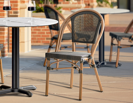 Our outdoor restaurant chairs are made from different materials, including resin, aluminum, and metal, but are all designed to withstand the elements and hold up during outdoor use.
