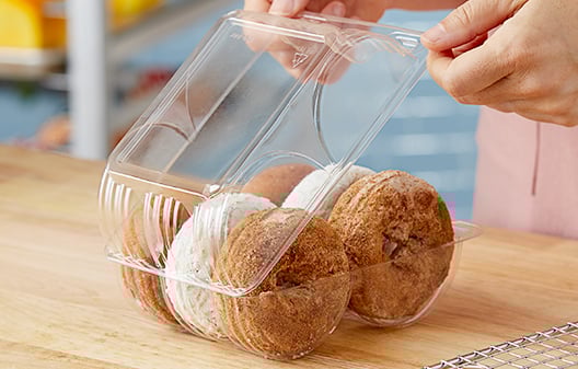 Clear hinged take-out containers provide a sturdy and durable vessel to store and transport your signature donuts while highlighting their contents.