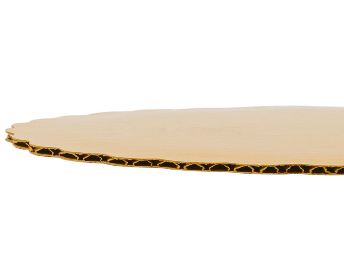Whether serving or packaging a cake, the presentation is almost as important as how the cake tastes. This product features a laminated decorative gold coloring that ensures your creations stand out for a stunning appearance. Plus, it is made with sturdy, single-wall corrugated cardboard to provide ample support for even the heaviest of cakes.