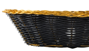 Customers appreciate the 9" x 6" Oval Black and Gold Rattan Basket for its aesthetic appeal and functionality. It is praised for its perfect size, quality, and durability, having been used daily for over a year. Ideal for presenting bread, pretzel rods, and as part of a cheese platter, its gold trim adds a classy touch. Highly recommended for its value and appearance.