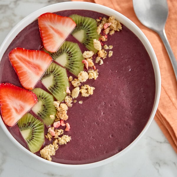 This ready-to-eat acai and guava sorbet is delicious on its own, or you can use it to make your own unique treats! This convenient product can be thawed and refrozen multiple times without negative effects on the sorbet's taste or texture. It's perfect for creating acai bowls topped with beautifully cut fruits, homemade granolas, coconut shavings, bee pollen, chia seeds, cacao nibs, nut butters, chopped nuts, and other tasty toppings! For extra fun, you can let patrons customize their own bowls for a special, personalized option, or you can create your own extensive menu of various acai bowls! Or, get creative and craft your own signature, homemade bowl for the exclusivity of having a one-of-a-kind acai bowl at your eatery! Try freezing this acai guava sorbet into popsicles for a refreshing, on-the-go snack that customers will love, or blending it into smoothies, shakes, and juices to create unique and flavorful beverages.