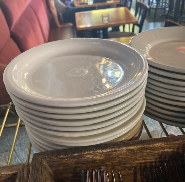 This dinner plate feels very heavy duty, and looks way more expensive than it is. The wide rim is a huge hit, and it is our most popular style of dinner plate that we rent out.
