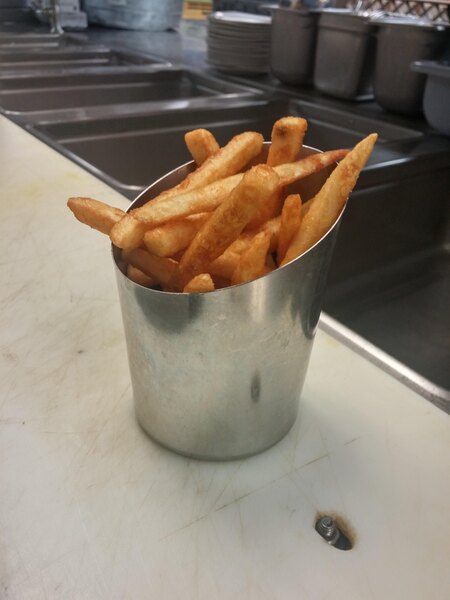 "The angled stainless steel french fry cup seems like the future of easy french fry portion control. The angled aspect makes for nice presentation and you can only fit so many fries into the cup, which saves the worry about how many fries your kitchen gives out when you arent ther..."