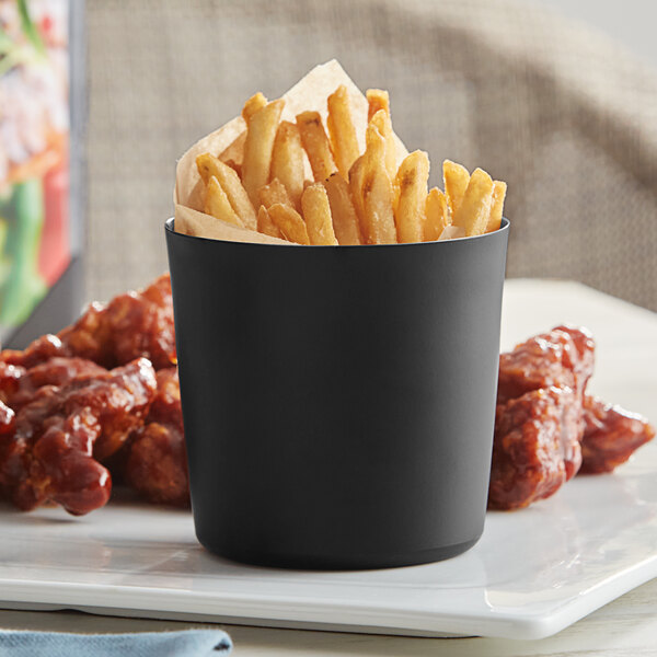 This french fry cup features a black powder-coated matte finish exterior with a stainless steel interior to create a trendy, more modern dining experience for your guests.