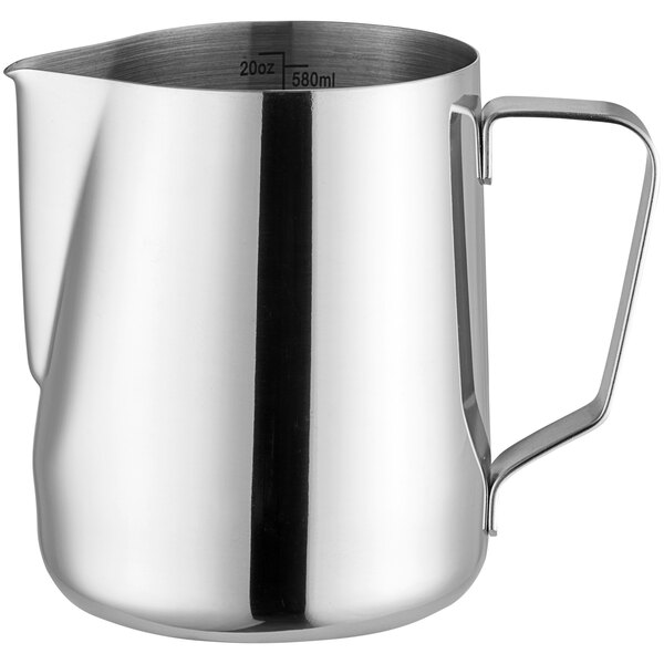This frothing pitcher is great for training baristas to create latte art atop your beverages to increase their perceived value; by simply moving the pitcher in various motions while pouring the foam, you can create a multitude of designs like hearts, leaves, or flowers. Treat customers in your coffee shop or cafe to a creamy hot beverage with just the right amount of rich, smooth foam with the help of this frothing pitcher!
