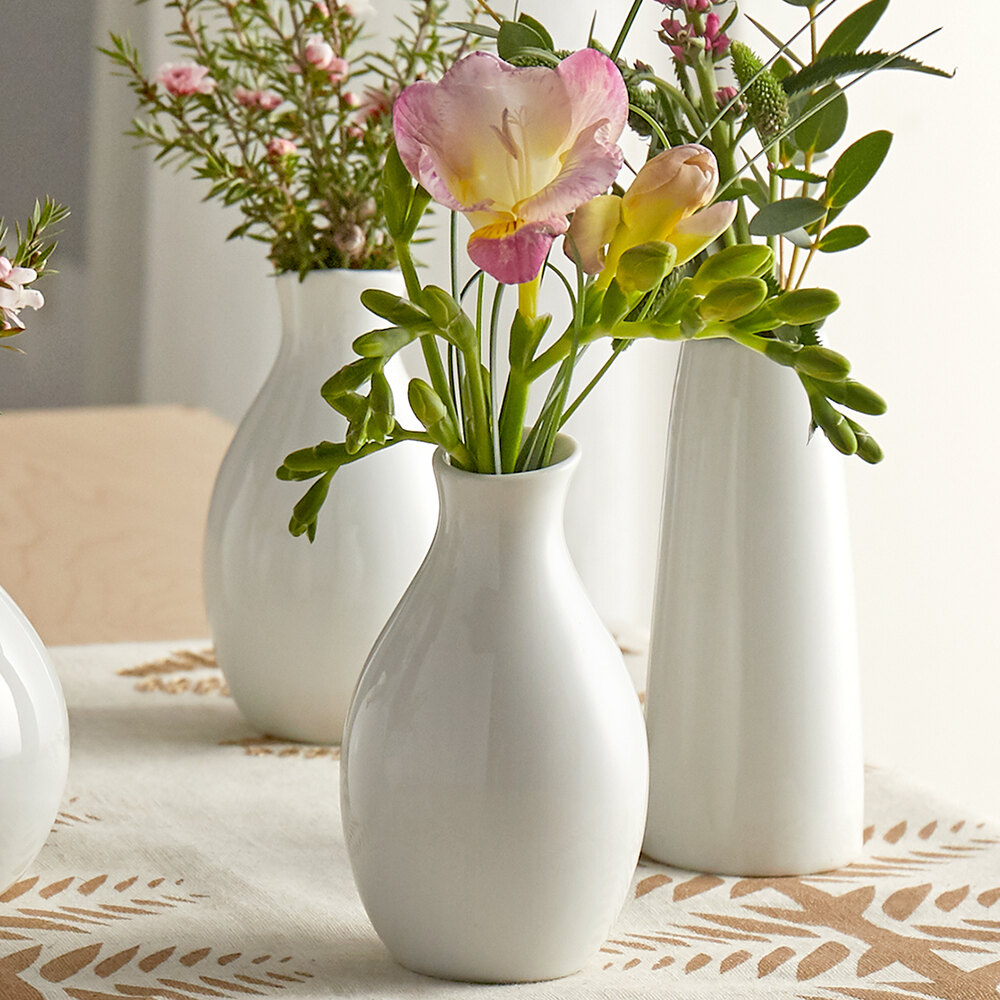 The acopa 3 3/4" bright white porcelain jug bud vase is amazing and makes for the perfect small accent piece for our catering events. They are very elegant, yet simple vases that are great for any occasion.