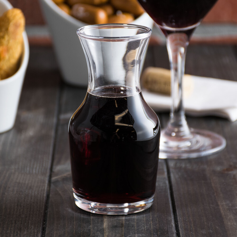 Whether it's wine by the glass at your restaurant or juice at a breakfast buffet, this carafe is the perfect vessel for service. This carafe is 6 oz. filled to the brim and 4 oz. filled to the shoulder. This provides portion control during the dinner rush in your busy restaurant; money that would typically be lost due to over pouring can be saved with the consistent pour this carafe allows! The clear glass construction and elegant shape provide a sophisticated air to your drink service. Leave it at a table for self service or use it to individually serve your guests your signature wines or cocktails.