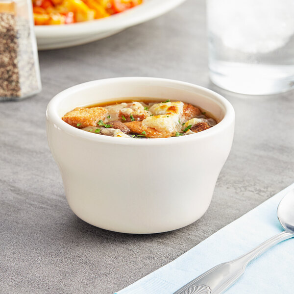 Perfect for smaller portions, this rolled edge stoneware bouillon cup is great for restaurants, diners, and cafes. Sporting an elegant design, this bouillon cup is sure to accent any decadent side you place before your patrons. Plus, the ivory (American white) color complements any table setting or restaurant decor to accent your theme and make your food shine.