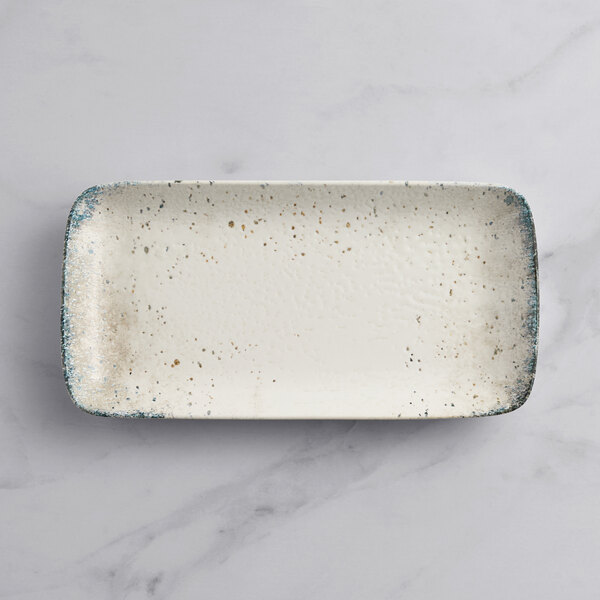 Crafted with fully vitrified porcelain, this platter ensures long-lasting durability that can withstand the demands of commercial use. The concrete gray color speckled with charcoal black pairs with the organic, rugged blue edge design to add a modern touch to your tabletop presentation, providing an understated yet elegant aesthetic that will complement any dish.