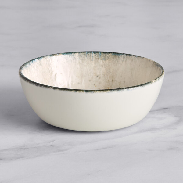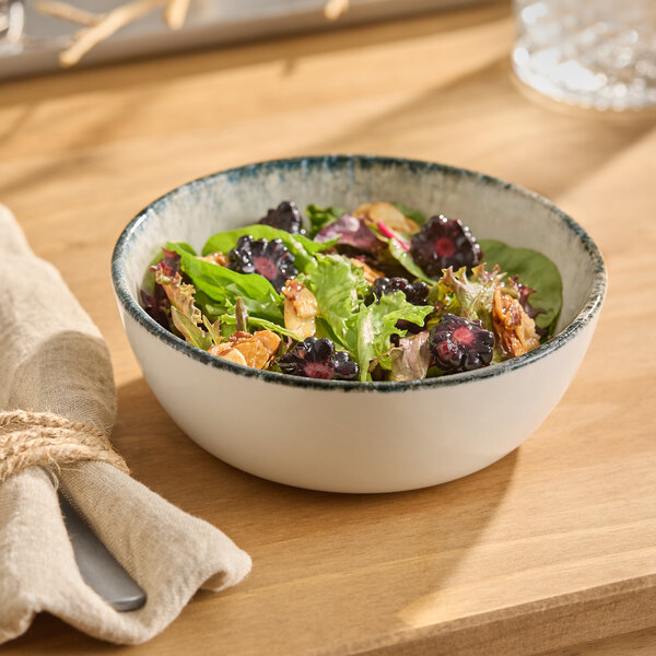 Crafted from fully vitrified porcelain, this bowl provides exceptional durability, ensuring long-lasting use in your upscale restaurant, diner, or cafe. The concrete gray color speckled with charcoal black pairs with the organic, rugged blue edge design to offer an understated modern aesthetic that will complement any tabletop setting.