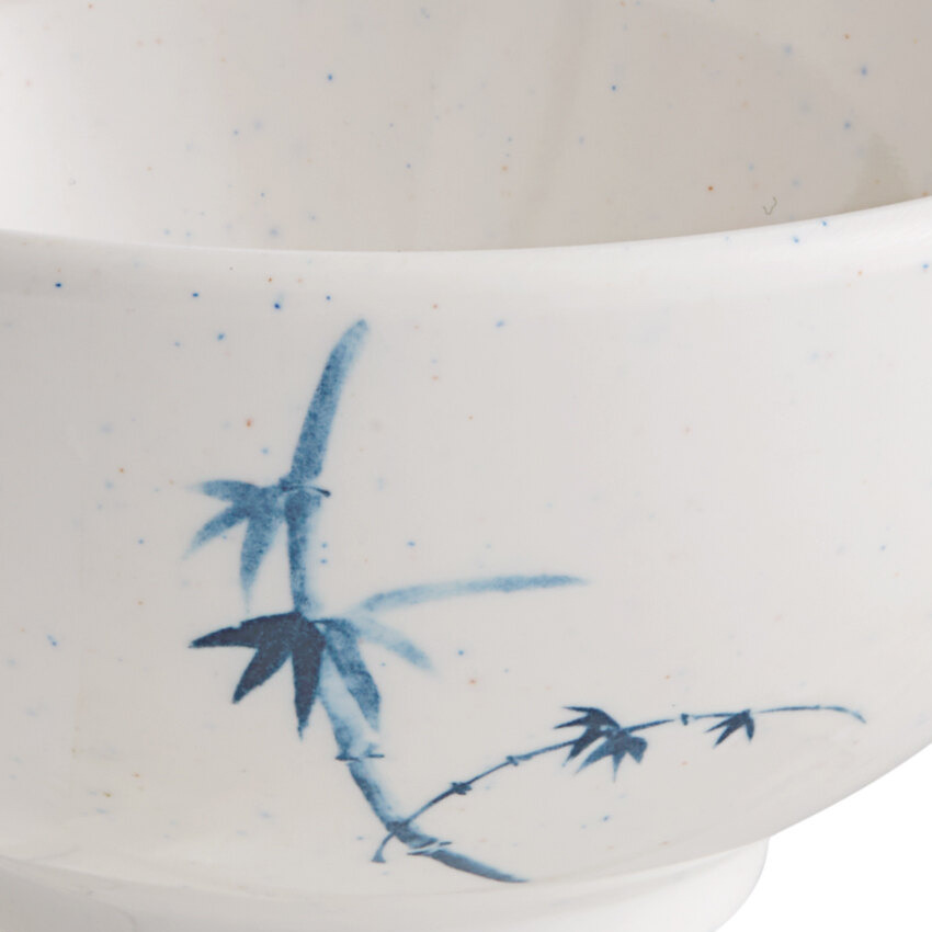Designed to bring an authentic Asian-inspired touch to any setting, this bowl combines the look and feel of ceramic with the strength and durability of melamine, making it ideal for high-traffic restaurants, catered events, and Asian-inspired venues. Its white and blue speckled body is beautifully complemented by a bamboo plant design, offering an attractive presentation for soups, sides, or small salads.