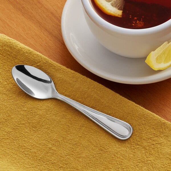 Add an elegant touch to your tabletop setting with this Acopa Edgewood 4 1/2" 18/0 stainless steel heavy weight demitasse spoon. This demitasse spoon features a smooth, rimmed handle with clean, simple lines and a slight bend for ease of use. It is perfect for use when serving espresso and small cappuccinos. With an 18/0 heavy weight stainless steel construction, this, this demitasse spoon is designed with the finest materials and the highest standards in mind.