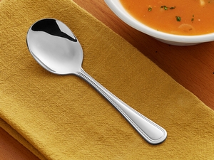 Complete your table setting with this Acopa Edgewood 5 1/2" bouillon spoon. Pair it with the rest of the Edgewood line to create a coherent and attractive table setting. Your guests are sure to appreciate the sturdy construction of this flatware, and it won't break your budget! Made of stainless steel, it will be a long lasting and attractive addition to your busy dining area. It is great for completing table settings at bistros, cafes, and catered events.