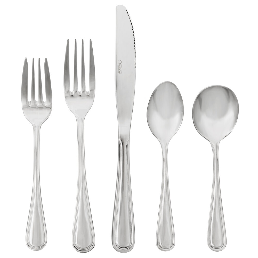 Complete your table setting with this Acopa Edgeworth flatware set. The set includes dinner forks, salad forks, bouillon spoons, teaspoons, and dinner knives, all with a mirror polished finish for a sophisticated appearance. Your guests are sure to appreciate the sturdy construction of this flatware, and it won't break your budget! Made of stainless steel, it will be a long lasting and attractive addition to your busy dining area. It is great for completing table settings at bistros, cafes, and catered events.