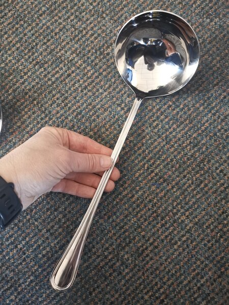 Very nice heavy 18/8 4 oz ladle. I have good selection of fork, knives, spoons, slotted and not slotted serving spoons etc. nice heavy duty. Very good price.