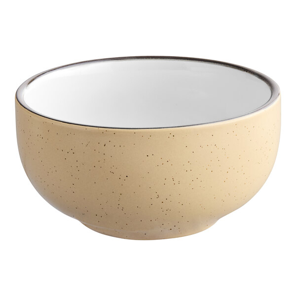 The stoneware bowl sports a duotone coloring with great contrast, helping to draw the eye and give your tabletop an inviting feel. The exterior boasts a rich tan color with a distinctive matte speckled glaze, while the glossy, bright white interior allows your menu items to pop.