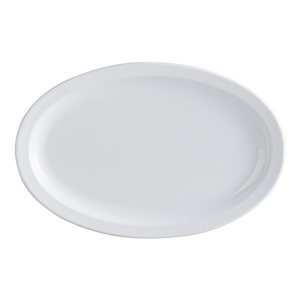 This platter is ideal for serving large portions of your most delicious breakfast foods or dinner entrees with sides. It is designed with an ergonomic oval shape and a narrow rim. The rim expertly frames each dish and helps prevent messes or spills by keeping foods and sauces contained on the platter! Plus, this platter's crisp white color provides optimal contrast, allowing your vibrant foods to seemingly pop off the table for an eye-catching appearance.