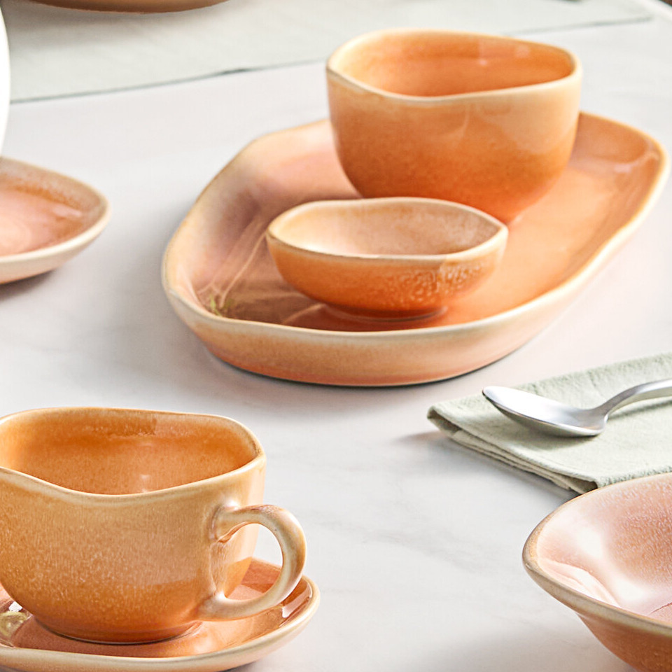 This mug's peach reactive glaze adds a touch of elegance to your table setting, creating a visually appealing presentation. Mix and match this primrose peach mug with other colors from the collection to create a dynamic and eye-catching display, or let it stand alone as a statement piece.