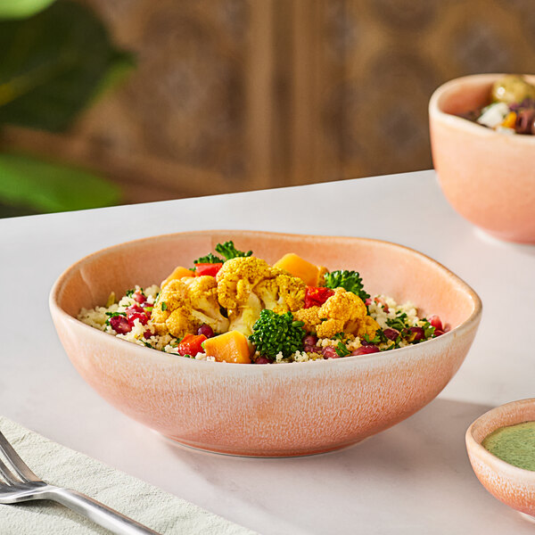 This bowl's peach reactive glaze adds a touch of elegance to your table setting, creating a visually appealing presentation. Mix and match this primrose peach bowl with other colors from the collection to create a dynamic and eye-catching display, or let it stand alone as a statement piece.