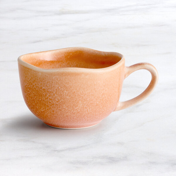 This cup's peach reactive glaze adds a touch of elegance to your table setting, creating a visually appealing presentation. Mix and match this primrose peach cup with other colors from the collection to create a dynamic and eye-catching display, or let it stand alone as a statement piece.