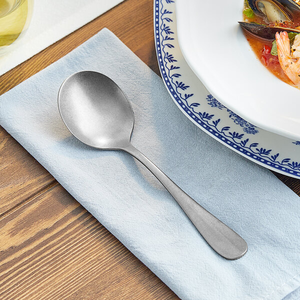 Enhance the dining experience of your patrons with the Acopa Josette 6 11/16" 18/8 distressed stainless steel extra heavy weight bouillon spoon.