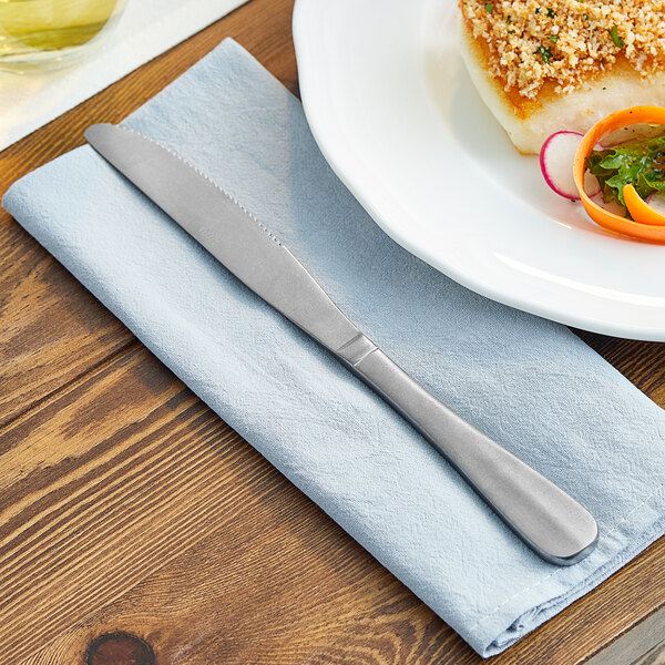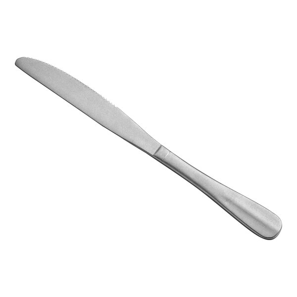 Enhance the dining experience of your patrons with the Acopa Josette 9 7/16" 18/8 distressed stainless steel extra heavy weight table knife.