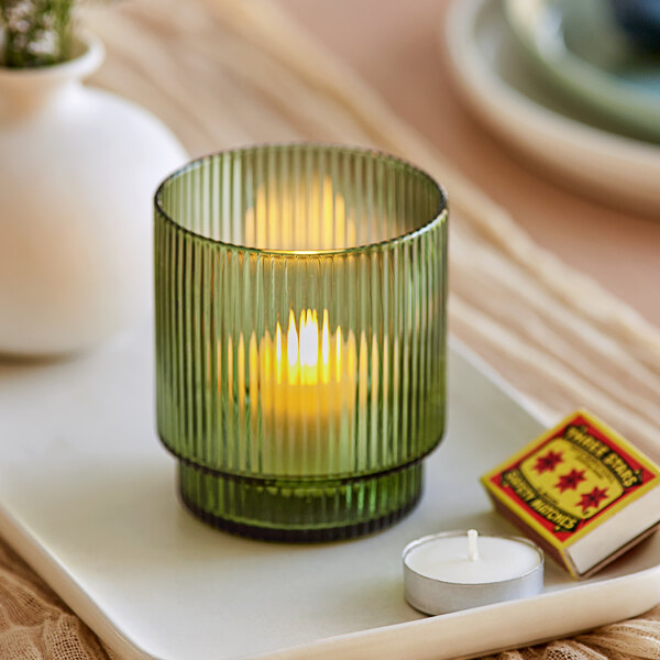 Add a touch of modern style to your establishment with this Acopa Lore 3 1/2" green glass ribbed tealight / votive holder.