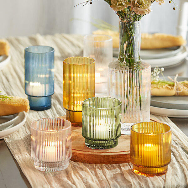 The green color of the glass will amplify the warm glow of the candle light to enhance the ambience of your dining area. The sleek and modern design of this tealight / votive holder features subtle ribbed lines that will grab the attention of your guests and add an elegant touch of flare to your table settings.