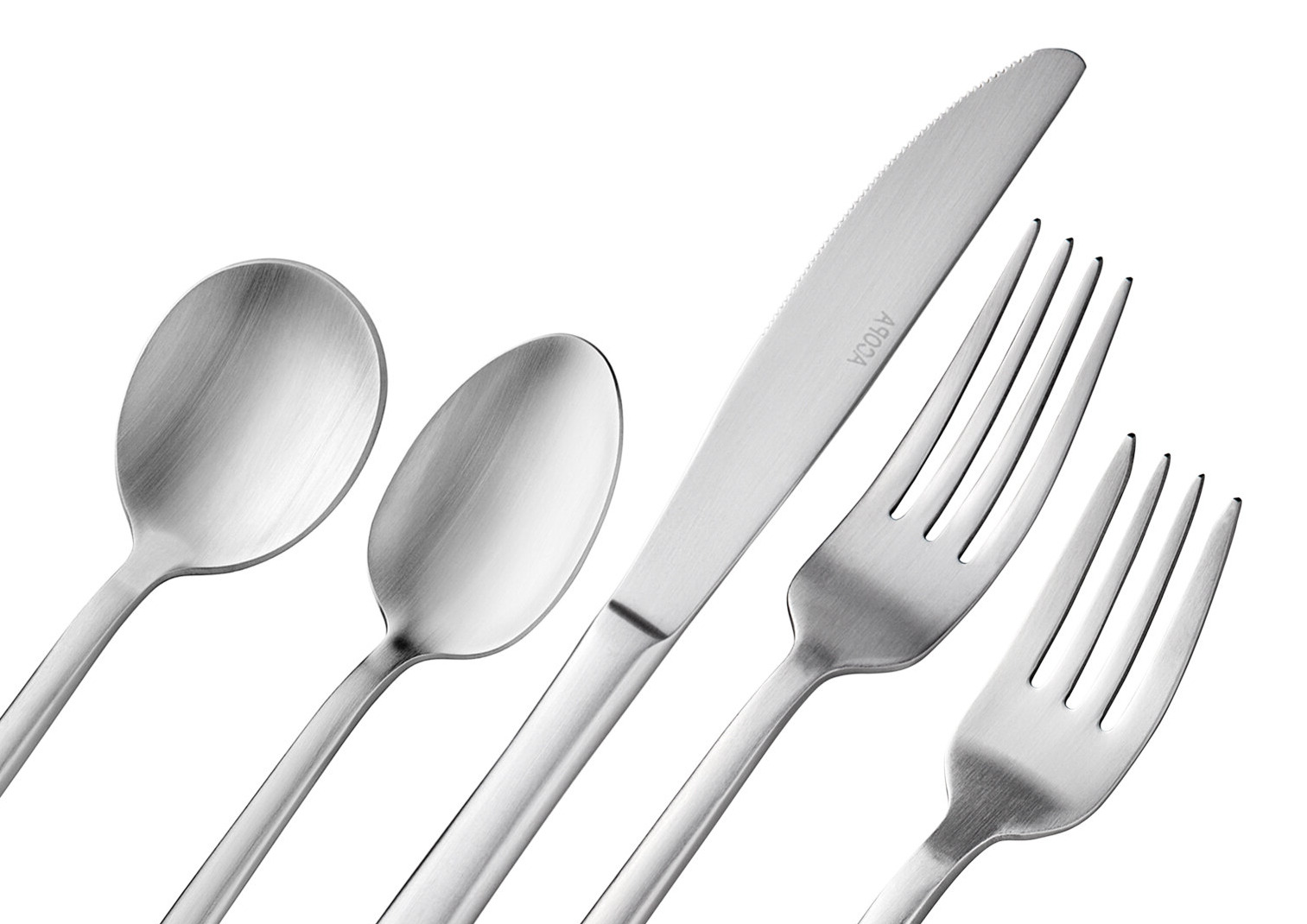 This set features clear lines and a modern design that will add a sleek touch to any dining area. Its brushed satin finish hides fingerprints and adds a sophisticated and timeless touch to tables. Despite its eye-catching finish, it doesn't take the focus away from your perfectly-plated culinary creations.