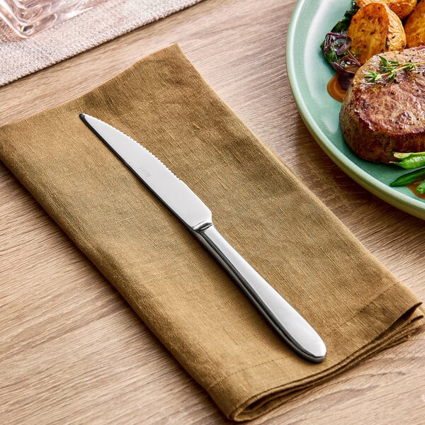 Bring a touch of style to your tabletop with this Acopa Remy 9" 18/8 stainless steel extra heavy weight steak knife. This steak knife is the perfect way to complete any table setting. As part of the Remy line, this piece of flatware features a simple design with subtle details so you can use it to dress up or dress down your tabletop service. It's made of extra heavy weight stainless steel for durability in your high-volume establishment. Plus, its corrosion and stain resistance ensure long-lasting use.