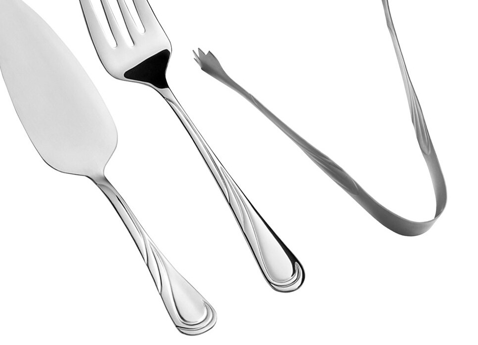 This set includes a solid spoon, slotted spoon, serving fork, ladle, pastry server, and ice tongs. This set is great for completing table settings at bistros, cafes, and catered events. Pair this set with other flatware from the Acopa Swirl collection for a complete set.