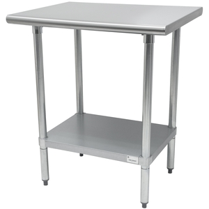 The 24" x 30" sound-deadened top shelf is made from 16-gauge, type 430 stainless steel and supports approximately 260 lb. of evenly distributed weight. It features easy-to-clean, rolled front and rear edges, and the sides of the table are squared off for flush placement against walls or other tables. To support the weight on top and maintain a level work surface, this work table is engineered with two reinforcing hat channels.