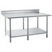 Each stainless steel work table is designed with a 1 5/8" sanitary rolled front edge with square sides and a 5" backsplash with a 1" return on the rear side. To ensure stability, this work table comes standard with 1 5/8" diameter tubular galvanized steel legs and matching leg braces. Additionally each table is fitted with 1" adjustable plastic bullet feet. It can support up to 450 lb. of evenly distributed weight.